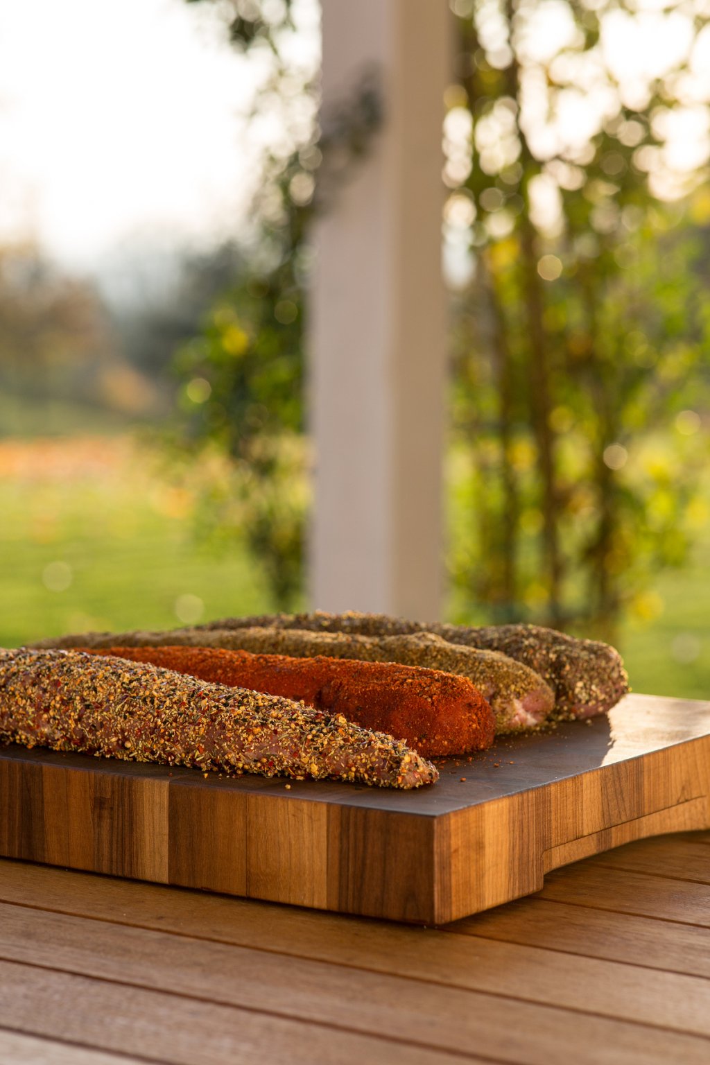 Bestreuen Sie das vorher gut eingelegte und gesalzene Fleisch mit der Gewürzmischung und geben Sie das direkt in die Räucherkammer. Es ist auch möglich, das Räuchergut zuerst mit hochwertigem Öl zu bestreichen und erst dann zu bestreuen. Der Rauchgeschmack wird durch die Kräuter und Gewürze wunderbar verfeinert.