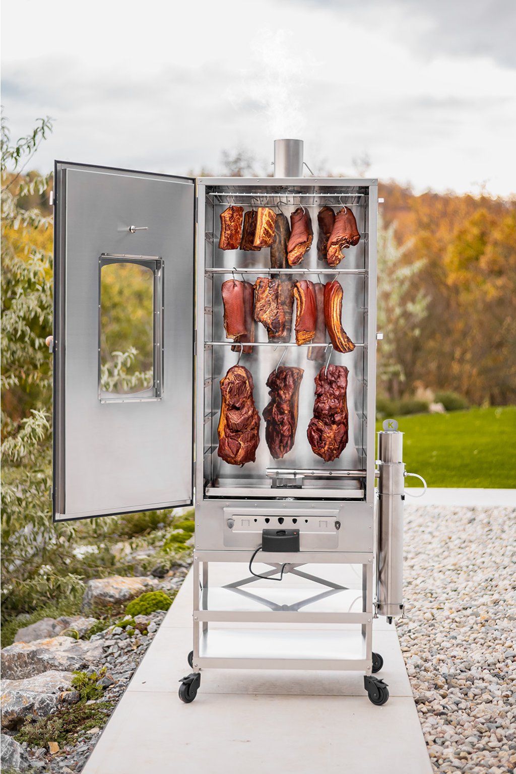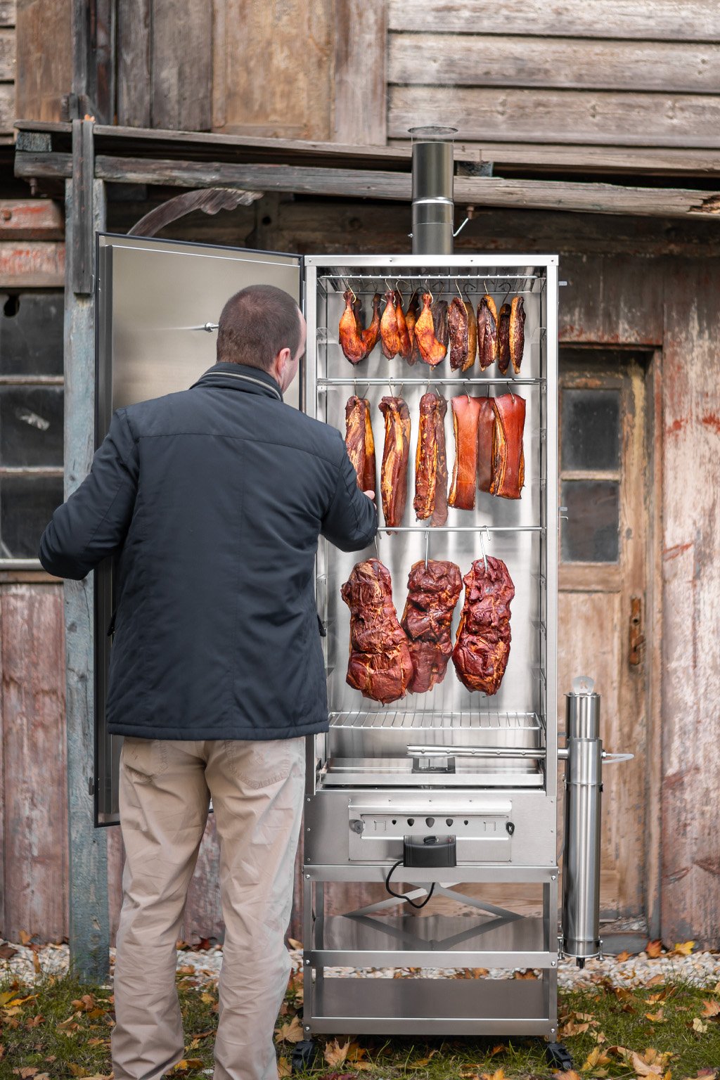 Dank der doppelwandig isolierten Konstruktion können Sie den Räucherschrank übers ganze Jahr nutzen. ER ist ideal für den Garten, eine Terrasse, oder Sie können den RÄUCHERSCHRANK an einen externen Rauchabzug anschliessen.